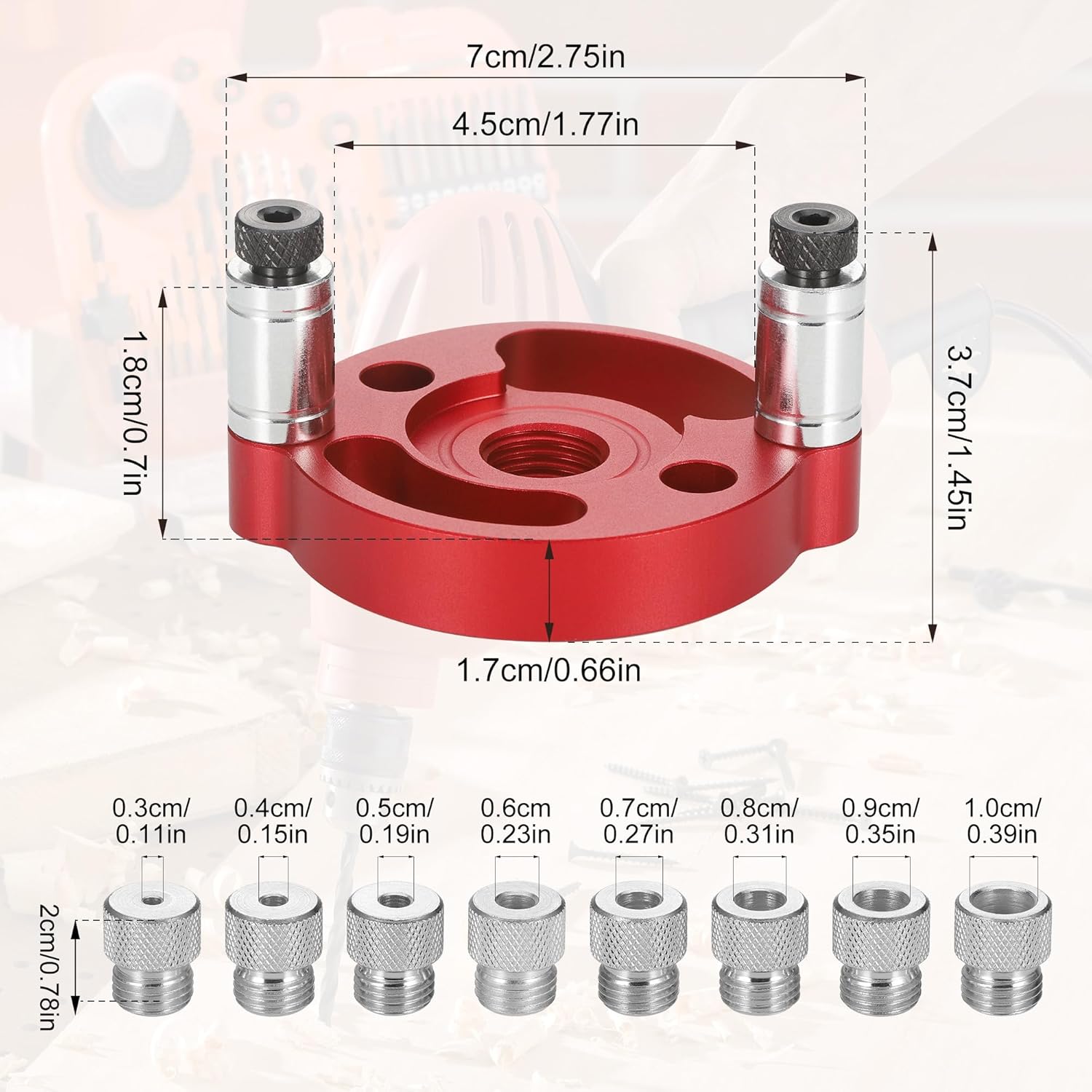 Guía autocentrante de precisión para realizar perforaciones exactas en los cantos de tableros de madera. Diseñada en aleación de aluminio anodizado, esta plantilla facilita la colocación de espigas o tarugos de 3 a 10 mm, gracias a su sistema de bujes roscados intercambiables. Ideal para uniones ocultas, ensamblajes rápidos y fabricación de muebles.