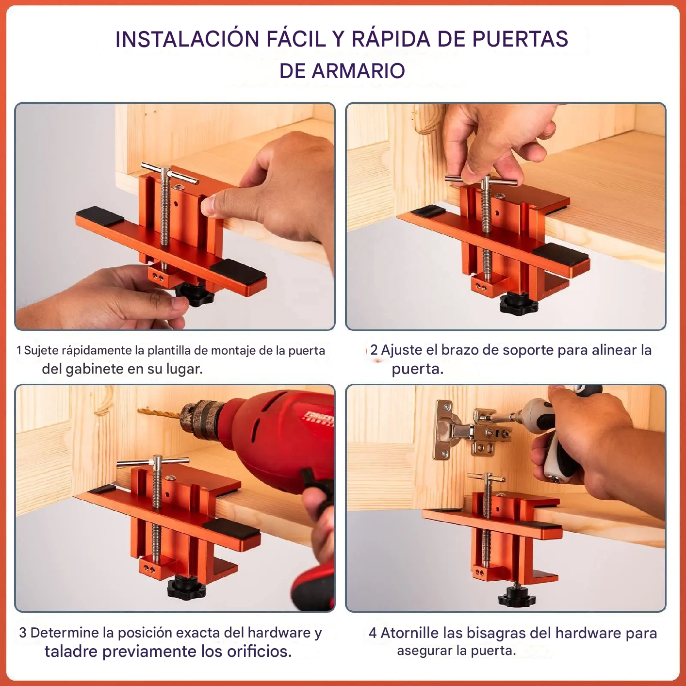 - Permite la correcta alineación, sujeción y perforación de bisagras y elementos de fijación, asegurando resultados profesionales.