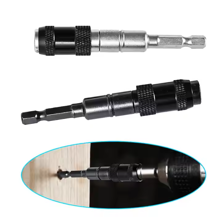 Soporte magnético de broca hexagonal con sistema de bloqueo y cambio rápido. Diseñado para uso en herramientas de mano y eléctricas, proporcionando estabilidad y precisión en la fijación de tornillos.
